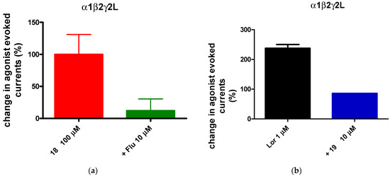 Very intriguing results emerged from derivatives bearing a hydroxymethyl or methoxymethyl group at position 3 of the scaffold (Figure 6b). In particular, the 8-chloro-3-hydroxymethyl-4-methylpyrazolo[1,5-a]quinazoline-5-one 18 behaves as an agonist, significantly enhancing the chlorine current at 100 μM (Emax + 100%). On the other hand, the 8-chloro-3-(methoxymethyl)-4-methylpyrazolo[1,5-a]quinazoline-5-one 19, which differs from 18 for the presence of the methoxymethyl chain at position 3, acts as a null modulator, thus indicating that the -OH group is important for agonist activity. These two compounds were tested in the presence of the antagonist flumazenil (compound 18) and of the agonist lorazepam (compound 19) (Figure 8a,b) to evaluate whether they act through the benzodiazepine binding site. Figure 8a reports flumazenil’s ability to antagonize 18 (100 µM), and Figure 8b shows the capacity of 19 to revert the agonist effect of lorazepam, in both cases confirming that the two compounds bind at the benzodiazepine binding site.