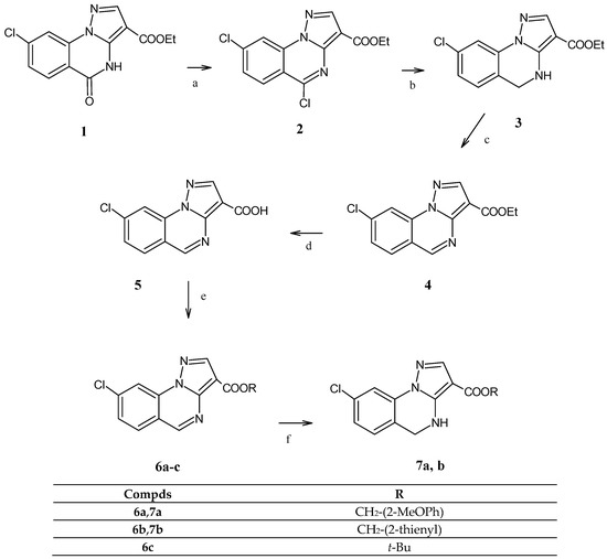 To obtain the final 8-chloropyrazolo[1,5-a]quinazolines and 8-chloro-5-oxo- 4,5-dihydropyrazolo[1,5-a]quinazolines of type 6 and 7, respectively (Scheme 1), the starting product, ethyl 8-chloro-5-oxo-4,5-dihydropyrazolo[1,5-a]quinazoline-3- carboxylate [10] 1, was reacted as previously reported by us [7] and afforded the ethyl 5,8-dichloropyrazolo[1,5-a]quinazoline-3-carboxylate 2. The latter undergoes reduction at 5-position (5-C-Cl) in sodium borohydride/ethanol/DCM, giving in a good yield the corresponding 4,5-dihydroderivative 3, which by 4,5-dehydrogenation performed in toluene and Pd/C gave the heteroaromatic derivative 4, ethyl 8-chloropyrazolo[1,5-a] quinazoline-3-carboxylate. The next hydrolysis (NaOH and then HCl) furnished the carboxylic acid 5, which in turn was transformed into 3-acyl chloride (not isolated), useful for the synthesis of the final desired esters (6a–c) by using the suitable alcohol (2-methoxybenzyl alcohol, 2-thiophenmethanol and t-butanol, respectively). Finally, the treatment of 6a and 6b with NaCNBH4/AcOH gave the final 4,5-dihydro-3-ester derivatives 7a,b.