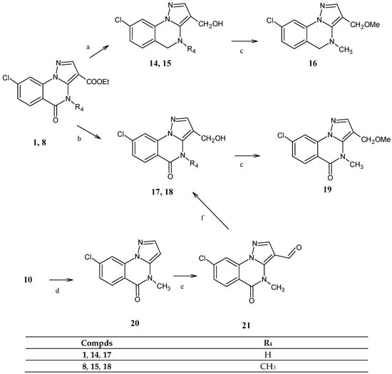 An alternative route to obtain compound 18 with a better yield is depicted at the bottom of the Scheme: starting from 10 [10], already seen in Scheme 2, a decarboxylation in HCl 12M was performed, obtaining compound 20, which, treated with HMTA (hexamethylenetetramine), gave the corresponding 3-carboxyaldeide derivative 21 that was quickly reduced (20 min, room temperature) to hydroxymethyl group with NaBH4/THF/methanol. Finally, all the 3-hydroxymethyl derivatives (14–18) were subjected to alkylation, achieving the final compounds 8-chloro-3-methoxymethyl-4-methyl- -4,5-dihydropyrazolo[1,5-a]quinazoline 16 and 8-chloro-3-methoxymethyl-4-methyl pyrazolo[1,5-a]quinazolin-5(4H)-one 19.
