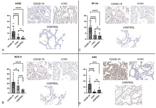 Graphs showing the comparison between COVID-19, H1N1, and CONTROL groups concerning ACE2, NOX4, NF-κB, and ASC. Panel (A) shows that ACE2 is significantly increased in COVID-19 when compared to H1N1 and the control group. In Panel (B), NOX4 is more expressed in COVID-19 than in the H1N1 and CONTROL groups. Images (C) and (D) also show that NF-κB. and ASC expression are remarkably high in COVID-19. These graphs show that the COVID-19 expressed characteristics needed for SARS-CoV-2 cell entry as well as oxidative stress and key components for inflammasome activity. The symbol “ * ” stands for p ≤ 0.05, “ *** “ stands for p ≤ 0.001, “****” stands for p ≤ 0.0001. Slide images were obtained on a 40× augmentation. Image created using biorender.com.
