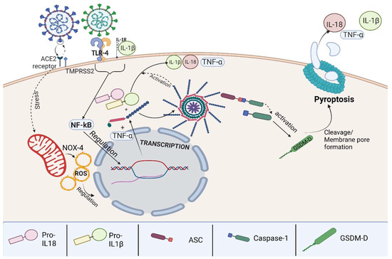 Graphical abstract demonstrating the viral infection stimulating ACE2 receptors and TLR4 receptors, modulating oxidative stress, and stimulating the NF-κB pathway followed by protein transcription culminating in pro-IL-1β, pro-IL-18, and TNF-α production. The process is then followed by NLRP-3 activation of pro-IL-1β, pro-IL-18, CASP1 activation, and GSDM-D cleavage leading to pore membrane formation.