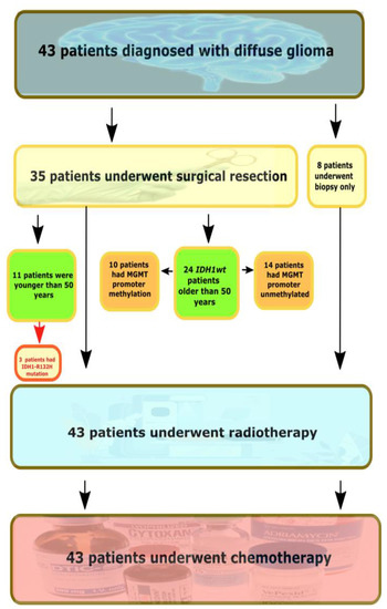 - Jovanović, N.; Mitrović, T.; Cvetković, V.J.; Tošić, S.; Vitorović, J.; Stamenković, S.; Nikolov, V.; Kostić, A.; Vidović, N.; Jevtović-Stoimenov, T.; et al. Prognostic significance of MGMT promoter methylation in diffuse glioma patients. Biotechnol. Biotechnol. Equip. 2019, 33, 639–644. [Google Scholar] [CrossRef]