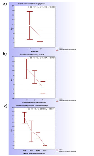 - Illic, R.; Somma, T.; Savic, D.; Frio, F.; Milicevic, M.; Solari, D.; Nikitovic, M.; Lavrnic, S.; Raicevic, S.; Milosevic, S.; et al. A Survival Analysis with Identification of Prognostic Factors in a Series of 110 Patients with Newly Diagnosed Glioblastoma Before and After Introduction of the Stupp Regimen: A Single-Center Observational Study. World Neurosurgery. 2017, 104, 581–588. [Google Scholar] [CrossRef]