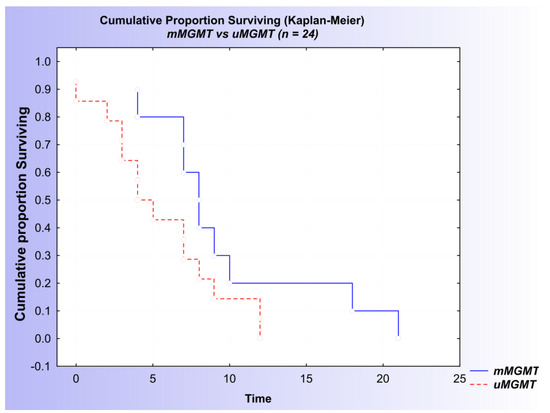 - Egaña, L.; Auzmendi-Iriarte, J.; Andermatten, J.; Villanua, J.; Ruiz, I.; Elua-Pinin, A.; Aldaz, P.; Querejeta, A.; Sarasqueta, C.; Zubia, F.; et al. Methylation of MGMT promoter does not predict response to temozolomide in patients with glioblastoma in Donostia Hospital. Sci. Rep. 2020, 10, 18445. [Google Scholar] [CrossRef]