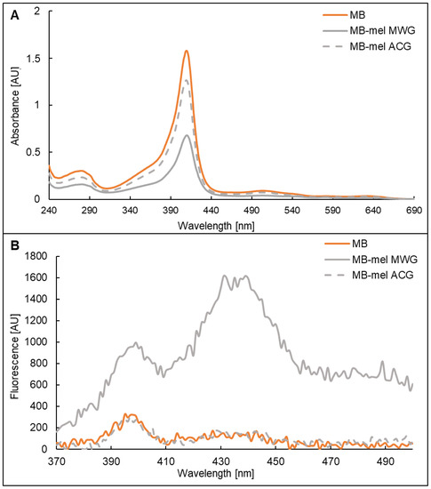Absorption (A) and fluorescence (B) spectra properties of the water solutions of MB (orange line), MB-mel MWG (grey solid line), and MB-mel ACG (dashed grey line) at a concentration of 0.5 mg/mL. Absorption spectra were recorded in a range from 240 to 690 nm, and fluorescence spectra upon excitation at 350 nm were recorded in a range from 370 to 500 nm.