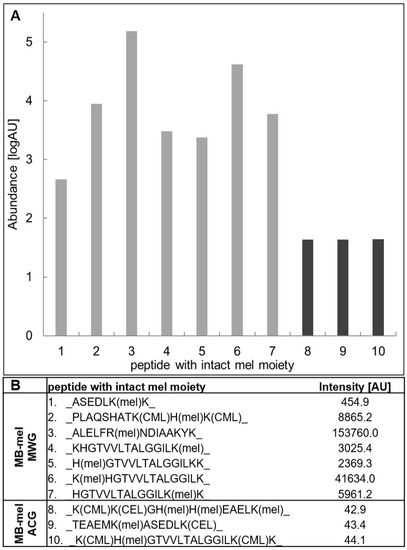 The abundance of the peptides modified with the intact mel moieties was identified on the glycated MB. Comparison of the abundance expressed as the log of MS signal intensities measured in arbitrary units (AU) recorded for peptides with the intact mel modification found in MB-mel MWG (light grey bars, peptides 1–7) and MB-mel ACG (dark grey bars, peptides 8–10) (A). The sequences of individual peptides (1–10) carrying the mel-modifications and their MS intensities are shown in table (B).