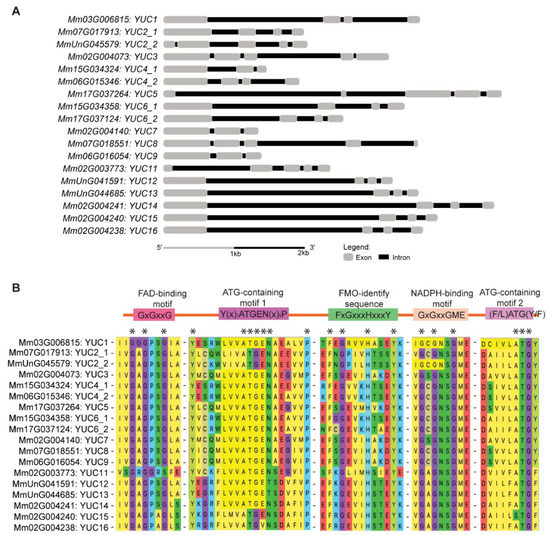 MmYUC members identified in M. micrantha genome. (A) Structure of MmYUC genes. The exons and introns are represented by grey boxes and black lines, respectively. (B) Alignment of conserved domains in MmYUCs. Stars (*) indicate the conserved amino acids in the motif.