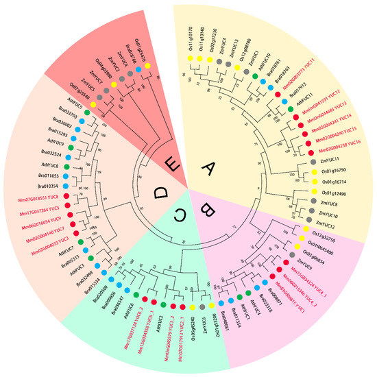 The amino acid sequences of YUC proteins from Arabisopsis thaliana, Oryza sativa, Brassica rapa and Zea mays were obtained from TAIR (https://www.arabidopsis.org/, accessed on 17 June 2020), RGAP (http://rice.plantbiology.msu.edu/, accessed on 17 June 2020), Brassica Database (http://brassicadb.org, accessed on 17 June 2020) and MaizeGDB (https://maizegdb.org/, accessed on 17 June 2020), respectively. MEGAX software (v.11) was used for phylogenetic analysis using the neighbor-joining (NJ) method under the Jones-Thornton-Taylor (JTT) model with 1000 replicates of bootstrap based on the alignment results from ClustalW program with the following parameters: substitution type, poisson model, uniform rates, partial deletion. The phylogenetic tree only showed branches with a bootstrap consensus > 50. Based on the multiple sequence alignment and phylogenetic analysis, the MmYUC genes were assigned to different groups and subgroups according to the classification of AthYUC genes reported previously.