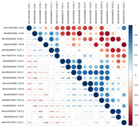 The correlation of gene expression patterns between every two MmYUC genes. Red color and blue color represent negative and positive correlation, respectively.