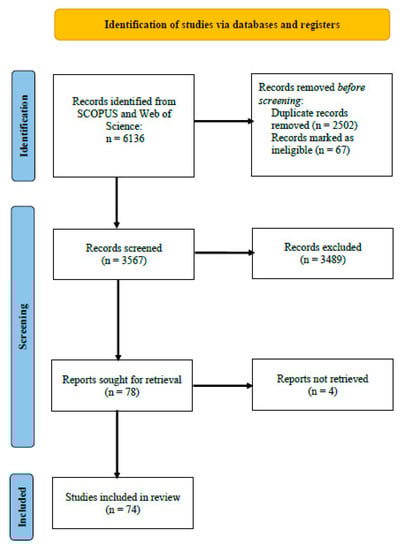 A literature search carried out in the Scopus and Web of Science database using the keywords “biofertilizers”, “waste” and “bacteria” yielded 6136 research articles. After data cleaning of duplicates and ineligible entries, 3567 articles remained. When the exclusion and inclusion criteria were applied to relevant articles based on the title and abstract screening, 3489 were excluded and were unable to retrieve two of them. A final list of 74 research articles was systematically analyzed and a table of evidence (ToE) was constructed and is provided in Table 5 and Table 6