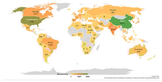 Geographical distribution of bioconversion research during the last five years (2017–2022).