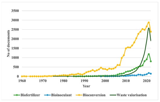 Trends in research publication using the keywords “waste valorisation”, “bioconversion” and “biofertilizer” over time.