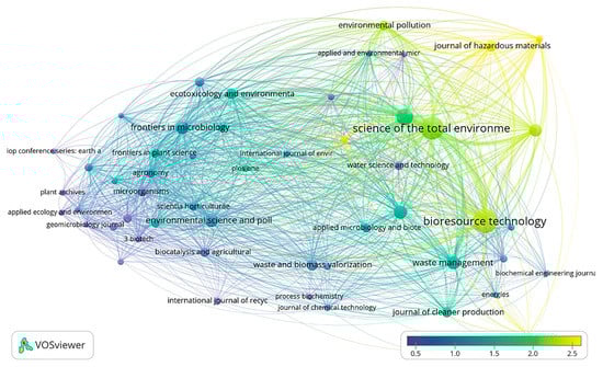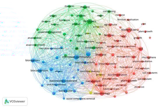 VOSviewer was used to allocate emerging themes of research and research trends of the past five years through analysis of bibliometric data. Figure 5 represents the co-occurrence mapping of author keywords by the full counting method through overlay visualization. The minimum co-occurrence of the author keywords in the research articles was set to 119 to identify the top 100 major keywords from more than 21,600 author and index keywords retrieved from multiple search strategies. These major keywords present a rather clear picture of the current directions of research in the field of bioorganic fertilizer production. A stark distinction exists between research associated with bioorganic fertilizer production strategies such as composting, anerobic digestion, biodegradation of wastes (manure), plant growth promotion abilities of microbial inoculants (biofertilizers), bioremediation, phytoremediation, and wastewater treatment. The identification of relevant microbial community appears to be at the center of all the connected themes.