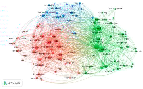 Similarly, Figure 6 presents the plot of the co-occurrence map based on textual data provided in the title and abstracts of the research articles used in the study. Filtering of terms by binary counting, indicating their presence or absence in a research article and setting the minimum number of occurrences to 85, resulted in 100 relevant terms out of 69,247, based on 60% relevance. Co-occurrence mapping of the textual data also revealed three distinct groups of research interest, namely plant growth enhancement, the composition of microbial communities (such as diversity, structure, and succession) in biodigestion processes, and waste treatment strategies. An enormous volume of research has been generated that explores the plant growth promoting the potential of microbial inoculants as biofertilizers based on their ability to produce indole acetic acid (IAA), siderophores, hydrogen cyanide (HCN), ACC deaminase, phytohormone production, salt tolerance, and micronutrient solubilization. Conversion of secondary raw materials to value added products and removal of organic pollutants through waste treatment are some basic waste management techniques often prospected. Similarly, deciphering composition of the microbial communities provides insight into the structure and diversity of the microbial species such as Proteobacteria, Acidobacteria, Bacteroidetes, methanogens, and their significant functional roles in composting and anaerobic digestion processes.