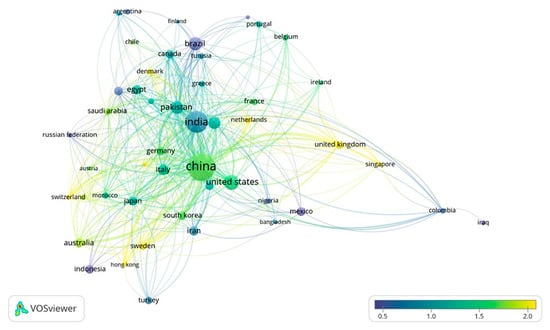 Based on the data exported from the Scopus database using a preliminary search of the keyword “biofertilizer” during the years 2017–2022, the geographical distribution of the research was plotted and indicated in Figure 3. As observed on the map, countries such as India, China, and South American countries seem to produce the most research in the field of biofertilizers. A comparison between the number of research articles produced per keyword can be seen in Figure 4.