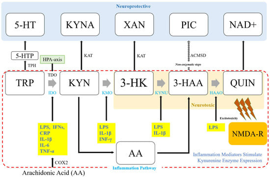 Schematic connection between the kynurenine pathway and nflammation. The kynurenine pathway (KP) bifurcates into two distinct branches modulated by the availability of l-kynurenine in the brain: KATs, and KMO. In addition, a variety of inflammation-related mediators known to affect enzyme expression can regulate the metabolism of kynurenine by adjusting substrate availability and metabolite formation, preferring the KMP direction of the pathway with immune-related pathological conditions. TRP, tryptophan or L-tryptophan; TDO, TRP 2,3-dioxygenase; 5-HT, serotonin; KYN, kynurenine or l-kynurenine; 5-HTP, 5-hydroxytryptophan; HPA-axis, hypothalamic-pituitary-adrenal axis; KYNA, kynurenine acid; 3-HK, 3-hydroxykynurenine; AA, anthranilic acid; XA, xanthurenic acid; NAD+, nicotinamide adenine dinucleotide; PIC, picolinic acid; 3-HAA, 3-hydroxyanthranilic acid; ACMSD, aminocarboxymuconate semialdehyde decarboxylase; QUIN, quinolinic acid; NMDA-R, N-methyl-D-aspartate receptor; IDO, indoleamine-2,3-dioxygenase; KAT, kynurenine aminotransferase; KMO, kynurenine 3-monooxygenase; KYNU, kynureninase; HAAO, 3-hydroxyanthranilic acid oxidase; LPS, lipopolysaccharide; BCG, bacillus Calmette-Guerin; IFNs, interferons; TNF, tumor necrosis factor; IL, interleukin; TNF-α; tumor necrosis factor alpha, IFN-γ, interferon gamma; COX2, cyclooxygenase 2.
