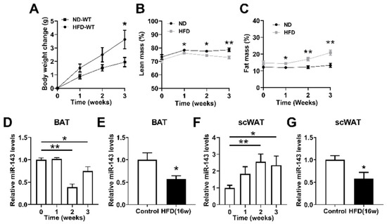 miR-143 is downregulated in BAT of mice induced by HFD. (A) The body weight of mice fed HFD or ND (n = 8). (B,C) The fat and lean mass of mice fed ND or HFD (n = 8). (D,F) The miR-143 expression in BAT (D) and scWAT (F) of mice fed HFD for indicated times lengths (n = 8). (E,G) The miR-143 expression in BAT (E) and scWAT (G) of mice fed HFD for 16 weeks (n = 8). Data are presented as the mean ± SEM. * p < 0.05 vs. controls; ** p < 0.01 vs. controls, as determined by a two-tailed unpaired Student’s t-test.
