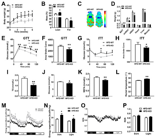 miR-143KO reduced HFD-induced obesity by increasing energy expenditures in BAT. (A–D) Body weight of WT and KO mice fed HFD (n = 8). (B–D) fat mass (B), quantitative magnetic resonance (C), and organ weight (D) in WT and KO mice fed HFD for 16 weeks (n = 8). (E–H) The glucose tolerance test (n = 12) and insulin tolerance test (n = 8) of mice fed HFD for 10 days. (I–K) The TG, glucose, and NEFA levels of serum of mice fed HFD for 16 weeks (n = 8). (L) The rectal temperature of WT and KO mice fed HFD for 16 weeks (n = 8). (M–P) Energy expenditure and RER of 8-week-old WT and KO mice fed HFD for 10 days (n = 4). Data are presented as the mean ± SEM. * p < 0.05 vs. controls; ** p < 0.01 vs. controls, as determined by a two-tailed unpaired Student’s t-test.
