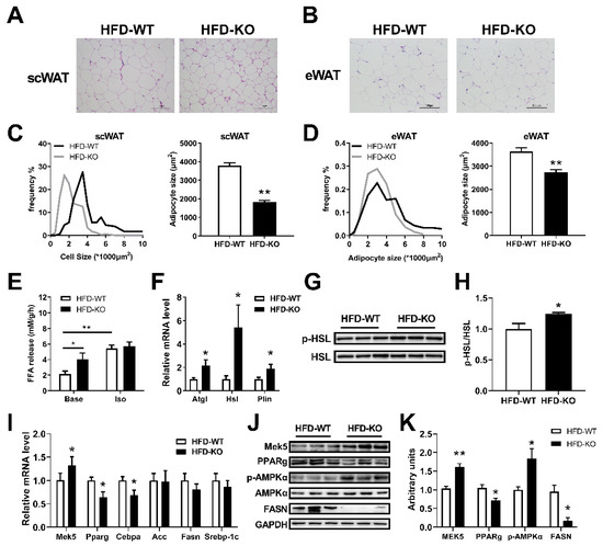 We further studied the effect of miR-143KO on lipolysis and adipogenesis in WAT of mice fed with HFD. MiR-143KO significantly reduces the area and distribution of scWAT and epididymal adipose tissue (eWAT) (Figure 6A–D). The scWAT of KO mice showed a stronger release capacity of NEFAs under basal condition (Figure 6E), while the lipolysis-related genes and p-HSL protein were increased as well (Figure 6F–H). Moreover, miR-143KO significantly increased the mRNA (Figure 6I) and protein (Figure 6J,K) levels of MEK5, which is one of the target genes of miR-143 [18]. Furthermore, miR-143KO significantly decreased adipogenic-related genes, PPARγ and FASN protein and increased p-AMPKα, protein in scWAT (Figure 6I–K). Thus, the increased lipolysis and inhibited adipogenesis in WAT could contribute to the suppression of obesity by miR-143KO.