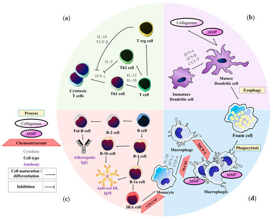 Role of monocytes, macrophages, dendritic cells, T-cells, and B-cells in atherosclerosis: (a) T-cells in atherosclerosis: Existence of IL-12 and IL-18 trigger Th1 skewing and secretion of IFN-γ to recruit cytotoxic T cells [9,10,11]. IL-5 secreted by Th2 cells [22] with IL-10 and TGF-β secreted by regulatory T cells (T reg) inhibit the function of IFN-γ [30,31]; (b) Dendritic cells in atherosclerosis: IFN-α, IFN-β and CCL-5 secreted by dendritic cells stimulate maturation of immature dendritic cell into the mature dendritic cell [19]. Mature dendritic cells produce metalloproteinase (MMP) and collagenase to destabilize atherosclerotic plaque. Mature dendritic cells also take up oxLDL by exophagy and transform into foam cells [20]; (c) B-cells in atherosclerosis: B-cells differentiated into 2 main subtypes, B1 cells, and B2 cells. In B1 cells, it further differentiates into B-1a and B-1b cells, both secrete athero-protective IgM. B-1a cell derived from B-1a cell secretes GM-CSF to enhance the proliferation of Ly6C monocytes. In B-2 cell, Follicular B cell (Fol-B) produce atherogenic IgG [39]; (d) Monocytes and macrophages in atherosclerosis: The presence of potent inflammatory cytokines, IL-18, TNF-α and IFN-γ, they initiate atherosclerosis by activating monocytes and macrophages. Macrophage colony-stimulating factor (M-CSF) monocytes stimulate the differentiation of monocytes into macrophages. Monocytes chemoattractant protein-1 (MCP-1) further attract other macrophages to phagocytose oxLDL to become foam cells as well as metalloproteinases (MMP) to degrade the fibrous cap of atherosclerotic plaque [12].