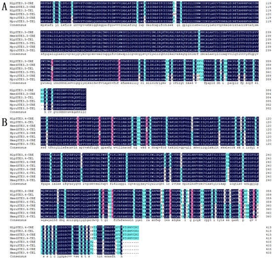 Homologous alignment of amino acid sequences of STE3.3 and STE3.4 in Melampsora. Note: Dark background refers to 100% identical; pink background refers to 75% to 100% identical; blue background refers to 50% to 75% identical; white background refers to lower than 30% identical; (A), STE3.3; (B), STE3.4.