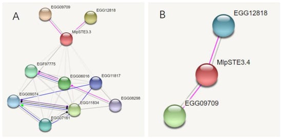 Both MlpSTE3.3 and MlpSTE3.4 can interact with protein kinase superfamily (EGG12818) and E3 ubiquitin ligase (EGG09709) directly through prediction by software STRING, and STE3.3 can act with one G-beta protein EGG09074, and a putative DNA-activated nuclear serine/threonine protein kinase EGG08298, Figure 3.