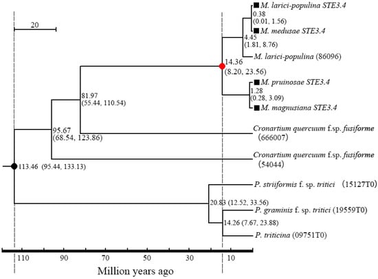 STE3.4 nucleotide sequences of wheat stripe rust (P. striiformis f. sp. tritici), wheat stalk rust (P. triticina), wheat stem rust (P. graminis f. sp. tritici), and pine west gall Rust (C. quercuum f. sp. fusiforme) were downloaded from the JGI Database (https://genome.jgi.doe.gov/portal/, accessed on 10 May 2021) to construct the sample molecular clock phylogenic trees. A query of the Timetree database (http://www.timetree.org/, accessed on 10 May 2021) shows that wheat stripe rust and Melampsora rust began to differentiate 114 million years ago []. Using this calibration point, the differentiation time of the selected sequence was calculated using the MCMCtree software []. We calibrated the nodes by using the highest posterior density (HPD) age values for the Melampsora + Puccinia divergence, and used normal distribution prior on the treeModel.rootHeight parameter. The substitution models for STE3.4 was GTR + G + I. Markov chain Monte Carlo (MCMC) was run for 100 million generations, sampling every 1000 generations, to estimate the posterior distribution of clade age and rates. Ten million generations were discarded as burn-in. All effective sample sizes were required to be greater than 200 given that the MCMC has reached convergence (http://tree.bio.ed.ac.uk/software/tracer/, accessed on 10 May 2021). An ultrametric maximum-clade-credibility (MCC) tree was summarized using TreeAnnotator 1.8, including divergence mean times and ranges above 95% probability.