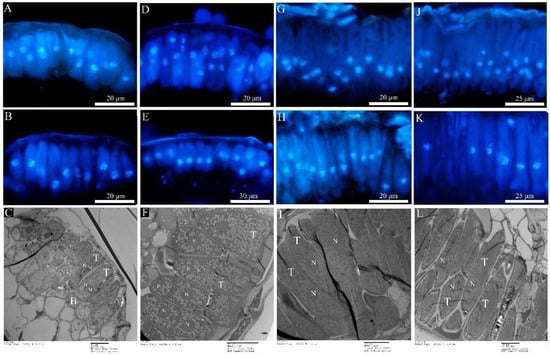 Teliospora under fluorescence microcopy and transmission electron microscopy. (A–C): Mlp; (D–F): Mmed; (G–I): Mmag; (J–L): Mpr; (A,D,G,J) refer to dikaryotic teliospore; (B,E,H,K) refer to the fusion and mononucleate (diploid) teliospore; (C,F,I,L) refer to teliospore under TEM; teliospore (T); basel cell (B); nuclei (N).