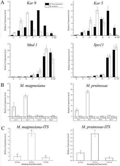 Quantitative PCR detection based on nuclei fusion gene, nuclei division genes, and internal transcript spacer (ITS). Note: (A), expressions of nuclei fusion gene (Kar9, Kar5) and division gens (Mnd1, Spo11), respectively in MLP telia and in Mmd telia; (B), expressions of Kar9, Kar5, Mnd1 and Spo11, respectively in MLP telia and in Mmd telia; (C), Fungal biomass at different collecting times, a–c in the bar charts refer to significant differences at 0.05 level.