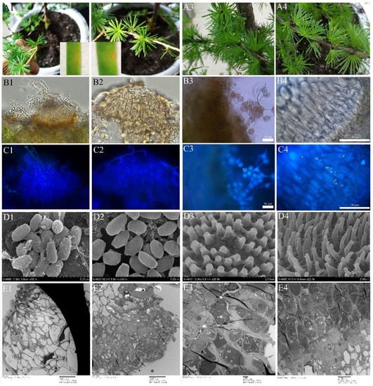 After rusts in P. purdomii and P. deltoides cv. “Zhonghua hongye” leaves developed basidiospores, the vitro leaves were suspended above needles of the 3-year-old larch seedlings, with the leaves adaxial surface down so that the spores may drop freely on the pine needles. The whole pine seedling was covered with a transparent plastic bag and cultured under 20 °C with photoperiod 16/8 h conditions each day. When pycnia appeared on the adaxial needles, we immediately sampled needles for pycniosprora and pycnia using fluorescence microscopy and TEM.
