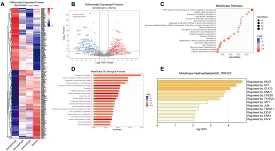 Proteomics analysis of normal pituitary gland and corticotroph adenomas, gonadotroph adenomas, and somatotroph adenomas. (A): A heatmap of differentially expressed proteins (FC > 1.5 or FC < 0.67 and FDR q < 0.1). High expression is shown in red; low expression is shown in blue. (B): Volcano map of differentially expressed proteins.** p < 0.01, *** p < 0.001 (C): KEGG pathway analysis based on differentially expressed proteins. (D): The most enriched GO terms. (E): Enrichment analysis in TRRUST showing differentially expressed proteins regulated by STAT3, REST, TFAP2A, and SNAI1 based on the Metascape database.