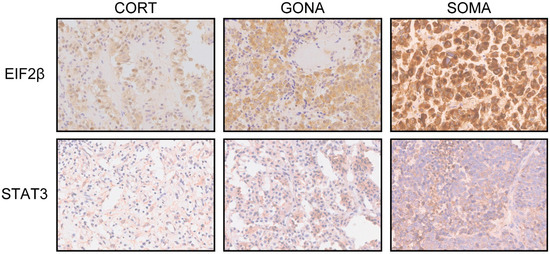 Immunohistochemistry images of EIF2β and STAT3 in corticotroph adenomas, gonadotroph adenomas, and somatotroph adenomas. CORT: corticotroph adenomas; GONA: gonadotroph adenomas; SOMA: somatotroph adenomas (×: 40 fold).