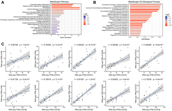Differential gene-enrichment analyses of different EIF2β groups in 28 patients with somatotroph adenomas. (A,B): Metascape enrichment analysis, including pathways and GO terms. (C): Correlation analysis of EIF2α/β and EIF2AK1-4 and STAT3.