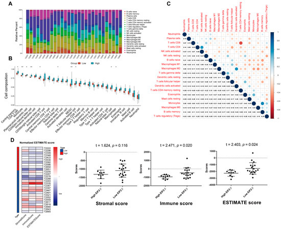 The immune landscape in the high- and low-EIF2β patient groups. (A): Heatmap from immune-cell signatures in 28 patients. (B): All 28 subtypes of tumor-infiltrating immune cells in patients with a high EIF2β compared with patients with a low EIF2β. The following conventions for symbols indicate statistical significance: blank: p > 0.05; *: p < 0.05; **: p < 0.01. (C): Heatmap showing that the ratios of the different tumor infiltration immune cell subgroups were moderately to strongly correlated. (D): Immune scores of 28 patients with somatotroph adenomas according to ESTIMATE.