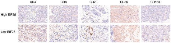 Immunohistochemistry images of CD4, CD8, CD20, CD86, and CD163 staining in the high- and low-EIF2β patient groups (×: 40 fold).