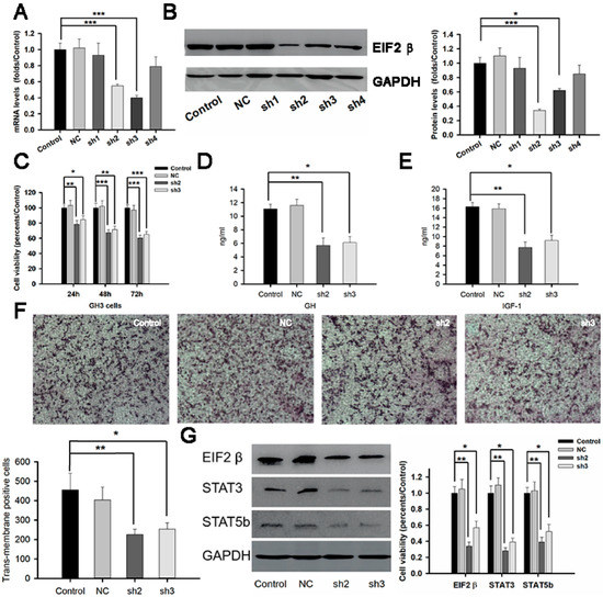 RNAi-EIF2β inhibited cell proliferation, growth hormone secretion, and invasion in vitro. (A,B): RT-PCR and Western blot experiments filtered the effective interference fragments of EIF2β in GH3 cells. (C): sh2-EIF2β and sh3-EIF2β reduced the cell viability of GH3 cells in a time-dependent manner. (D): sh2-EIF2β and sh3-EIF2β decreased growth hormone (GH) in GH3 cells. (E): sh2-EIF2β and sh3-EIF2β decreased insulin-like growth factor 1 (IGF-1) in GH3 cells. (F): sh2-EIF2β and sh3-EIF2β decreased trans-membrane-positive cells after 24 h treatment. (G): sh2-EIF2β and sh3-EIF2β reduced protein levels of STAT3 and STAT5b after 24 h treatment. * Compared to control group p < 0.05 ** p < 0.01 *** p < 0.001.