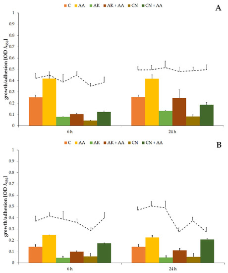 The bacterial growth (column graphs) and cell adhesion to the catheter (line graphs) of the P. mirabilis ATCC 29906 (A) and C12 (B) strains after 6 and 24 h of cultivation. Legend: C—control, AA—ascorbic acid, AK—amikacin, CN—gentamicin.