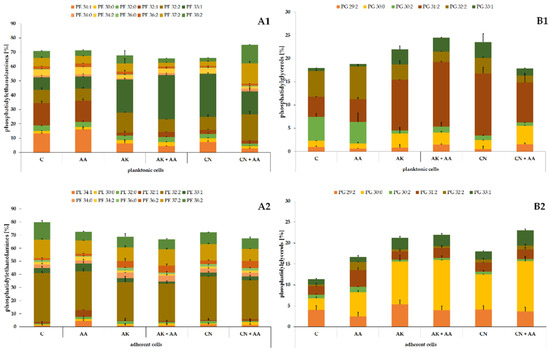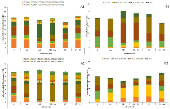 Percentage content of phosphatidylethanolamines (A) and phosphatidylglycerols (B) identified in the planktonic (1) and adherent (2) cells of the P. mirabilis ATCC 29906 strain treated with ascorbic acid, amikacin, or gentamicin. Legend: C—control, AA—ascorbic acid, AK—amikacin, CN—gentamicin.