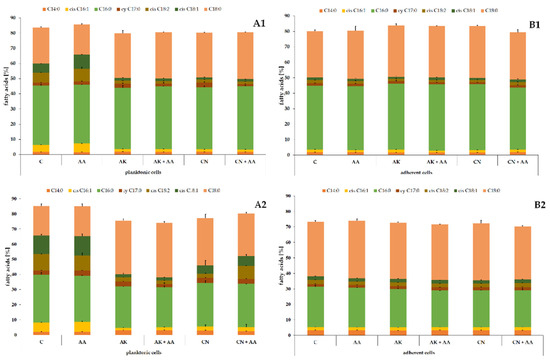For the adherent cells, these dependencies were as follows: supplementation with ascorbic acid increased the quantity of PG 30:2 (≤2.5-fold) and decreased the levels of PE 32:0 (≤53%), PE 33:1 (≤52%), PE 34:2 (≤35%), and PE 36:0 (≤45%) in comparison to the results obtained for the AK treatment. On the other hand, the presence of AA resulted in higher amounts of PE 30:0 (≤2-fold), PE 32:1 (≤3.7-fold), and PG 32:2 (≤2.2-fold) and lower abundance of PE 37:2 (≤33%) compared to the results obtained for the CN treatment (marked by ** in Table 3).