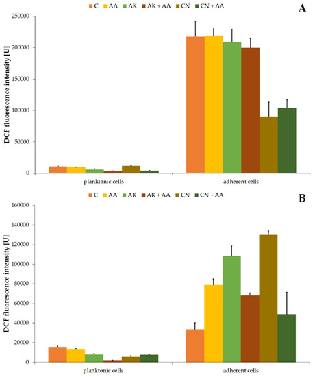 Changes of 2’,7’-dichlorofluorescein (DCF) fluorescence intensity in the planktonic and adherent cells of the ATCC 29906 (A) and C12 (B) strains treated with AA, AK, or CN. Legend: C—control, AA—ascorbic acid, AK—amikacin, CN—gentamicin.