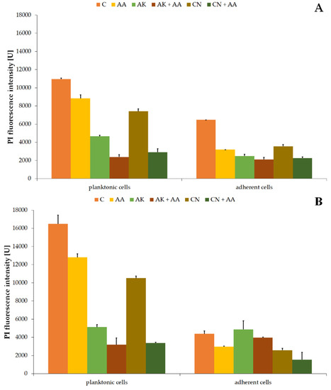Changes of propidium iodide (PI) fluorescence intensity in the planktonic and adherent cells of the ATCC 29906 (A) and C12 (B) strains treated with AA, AK, or CN. Legend: C—control, AA—ascorbic acid, AK—amikacin, CN—gentamicin.