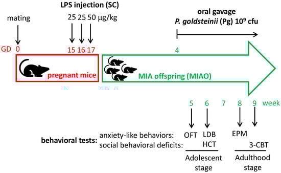 Experimental design for evaluating the ameliorative effects of Parabacteroides goldsteinii (Pg) MTS01 on the aberrant behaviors of offspring with lipopolysaccharide (LPS)-induced maternal immune activation (MIA). On gestation days (GD) 15, 16, and 17, pregnant mice were subcutaneously (SC) injected with 25, 25, and 50 μg/kg LPS, respectively. In the control group, pregnant mice were injected with phosphate-buffered saline. Female mice offspring were selected and grouped. Mouse offspring were orally gavaged with live Pg MTS01 at 1 × 109 colony-forming units (cfu) per day for 5 days per week from week 4 through to the end of the experiment. For anxiety-like behavior assessments, the open-field test (OFT), light–dark box (LDB) test, and elevated plus maze (EPM) test were conducted at the ages of 5, 6, and 8 weeks, respectively. Regarding the social behavioral deficits evaluation, the home cage test (HCT) and three-chamber behavioral test (3-CBT) were performed at 6 and 9 weeks of age, respectively.