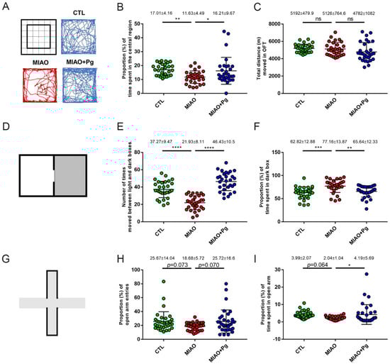 In this study, a total of 17 (MIAO), 18 (MIAO + Pg), and 13 (CTL) littermates were used for behavioral tests (details in Supplementary Table S1). The mice from different littermates were maintained at body weights (ranging from 16 to 20 g, aged 5 to 8 weeks old), locomotor activities (ranging from 49 to 52 m observed by OFT at 5 weeks of age), and muscle strength (scores ≥ 4 points, measured by standard wire-hanging evaluation at 8 weeks of age). All tested mice had similar physiological conditions throughout the study.