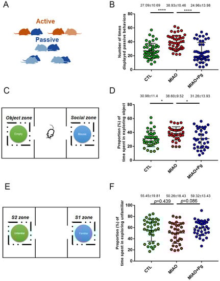 Parabacteroides goldsteinii (Pg) MTS01 ameliorates the social deficit behaviors of MIAO. Offspring from the phosphate-buffered saline control group (CTL), lipopolysaccharide-induced MIA group (MIAO), and MIAO orally gavaged with Pg MTS01 (MIAO + Pg) were evaluated for social deficit behaviors using the home cage test (n = 46; A,B) and three-chamber behavioral test (3-CBT, n = 34; C–F). A schematic representation of the phenotypic expression of active (nose-to-nose or nose-to-body) and passive (body-to-body) behaviors is presented (A). The number of times that passive behaviors were displayed was recorded (B). Schematic representation of the 3-CBT is presented (C,E). The proportion of time spent in the empty chamber (Object zone) in contrast to that in the Social zone was recorded (D). The proportion of time spent exploring unfamiliar (S2 zone) in contrast to familiar mice (S1 zone) is presented (F). Data are presented as the mean ± standard deviation. * p < 0.05; **** p < 0.0001 (one-way ANOVA, Tukey’s post hoc test).