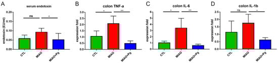 Parabacteroides goldsteinii (Pg) MTS01 ameliorates the gut inflammation of lipopolysaccharide (LPS)-induced MIAO. The serum endotoxin level (A) and colon inflammatory cytokine level (B–D) of offspring from the phosphate-buffered saline control group (CTL), LPS-induced MIA group (MIAO), and MIAO orally gavaged with Pg MTS01 (MIAO + Pg) were determined. Data are presented as the mean ± standard deviation. * p < 0.05; ** p < 0.01; ns, not significant (one-way ANOVA, Tukey’s post hoc test).