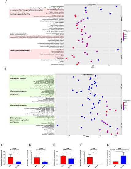 Transcriptome alterations in colon of MIAO orally gavaged with Parabacteroides goldsteinii MTS01. Dot plots of the significantly upregulated (normalized enrichment score [NES] > 1 and false-discovery rate [FDR] q value < 0.25) and downregulated ([NES] < −1 and FDR q value < 0.25) gene sets from gene set enrichment analysis of the MIAO + Pg group compared to the MIAO group (top 20 gene sets in GO_BP, GO_MF and GO_CC) are presented in (A,B), respectively. Gene sets with similar functions were labeled in color, and the functions were also added. Five genes contributing to the leading-edge subset within the gene sets (immune responses such as B cell receptor, lipopolysaccharide receptor, and chemokine responses; synapse responses such as synaptic membrane exocytosis) as validated by quantitative RT-PCR are presented in (C–G). Data are presented as the mean ± standard deviation. * p < 0.05; ** p < 0.01(unpaired Student’s t-test). MIAO + Pg, MIAO treated with P. goldsteinii MTS01.