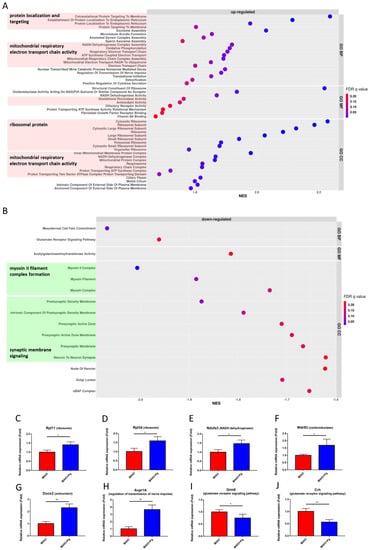 Transcriptome alterations in hippocampus of MIAO orally gavaged with Parabacteroides goldsteinii MTS01. Dot plots of the significantly upregulated (normalized enrichment score [NES] > 1 and false-discovery rate [FDR] q value < 0.25) and downregulated ([NES] < −1 and FDR q value < 0.25) gene sets from gene set enrichment analysis of the MIAO + Pg group compared to the MIAO group (top 20 gene sets in GO_BP, GO_MF and GO_CC) are presented in (A,B), respectively. Gene sets with similar functions were labeled in color, and the functions were also added. Eight genes contributing to the leading-edge subset within the gene sets (ribosome, oxidoreductase, NADH dehydrogenase, antioxidant, regulation of transmission of nerve impulse, and glutamate receptor signaling pathway) as validated by quantitative RT-PCR are presented in (C–J). Data are presented as the mean ± standard deviation. * p < 0.05; ** p < 0.01 (unpaired Student’s t-test). MIAO + Pg, MIAO treated with P. goldsteinii MTS01.