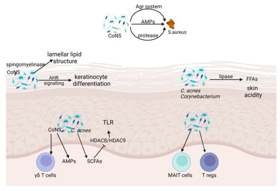 In addition to microbe-host relationships, microbe–microbe relationships act as a barrier against invasion, colonization, and infection by invading, pathogenic, or opportunistic microbes. The interactions maintain survival and sustain microbes’ niche and access to nutrients. While these relationships are not well understood, regulation of the coagulase-negative Staphylococcus (CoNS) species for S. aureus has been well studied [43]. CoNS species are among the most abundant microbes in the skin microbiome, including S. epidermidis, S. capitis, S. caprae, S. hominis, S. lugdunensis, and S. haemolyticus.