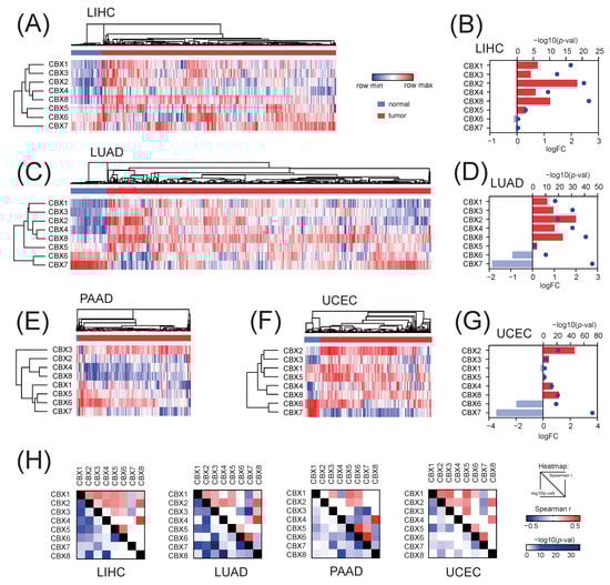 The expression of CBX family members in selected TCGA tumors. The level of CBX family members and differential CBX expression between tumor and normal adjacent tissues in (A,B) liver, (C,D) lung, (E) pancreatic and (F,G) uterine tumors. In the heatmaps, blue and red denotes low and high expression, respectively. Sample groups are color-coded accordingly: blue—normal tissue; red—tumor tissue. Bar plots depict the fold change (log2) of CBX expression in tumor vs. normal tissues. The statistical significance (−log10(p-value)) is marked with blue dots. (H) The correlation of CBXs expression in selected TCGA tumors. The upper part of the heatmaps presents the Spearman correlation coefficient, while the lower part shows the statistical significance of the correlation (−log10(p-value)).