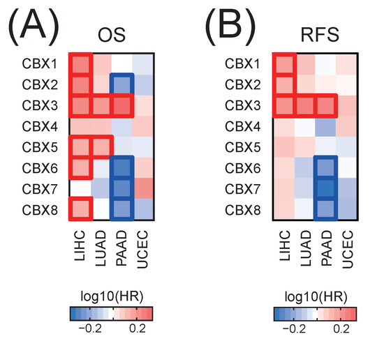 The association between CBX family members and patient prognosis in selected TCGA tumors. The heatmap of the hazard ratio of death (A) or relapse (B) for patients with high expression of specific CBX family members (with the mean expression as a cut-off). Red and blue denote higher or lower hazard ratios, respectively. Bordered squares denote statistically significant HRs (p < 0.05).